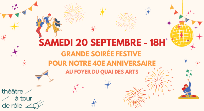 Venez célébrer avec nous la date de fondation officielle de notre compagnie et nos 40 ans d’histoire, de création, d’engagement artistique et de rayonnement culturel! Au programme de cette soirée rassembleuse et réjouissante : piste de danse/DJ set, animation, témoignages, invités spéciaux, archives, surprises et plaisir en abondance ! 🎶 🎉