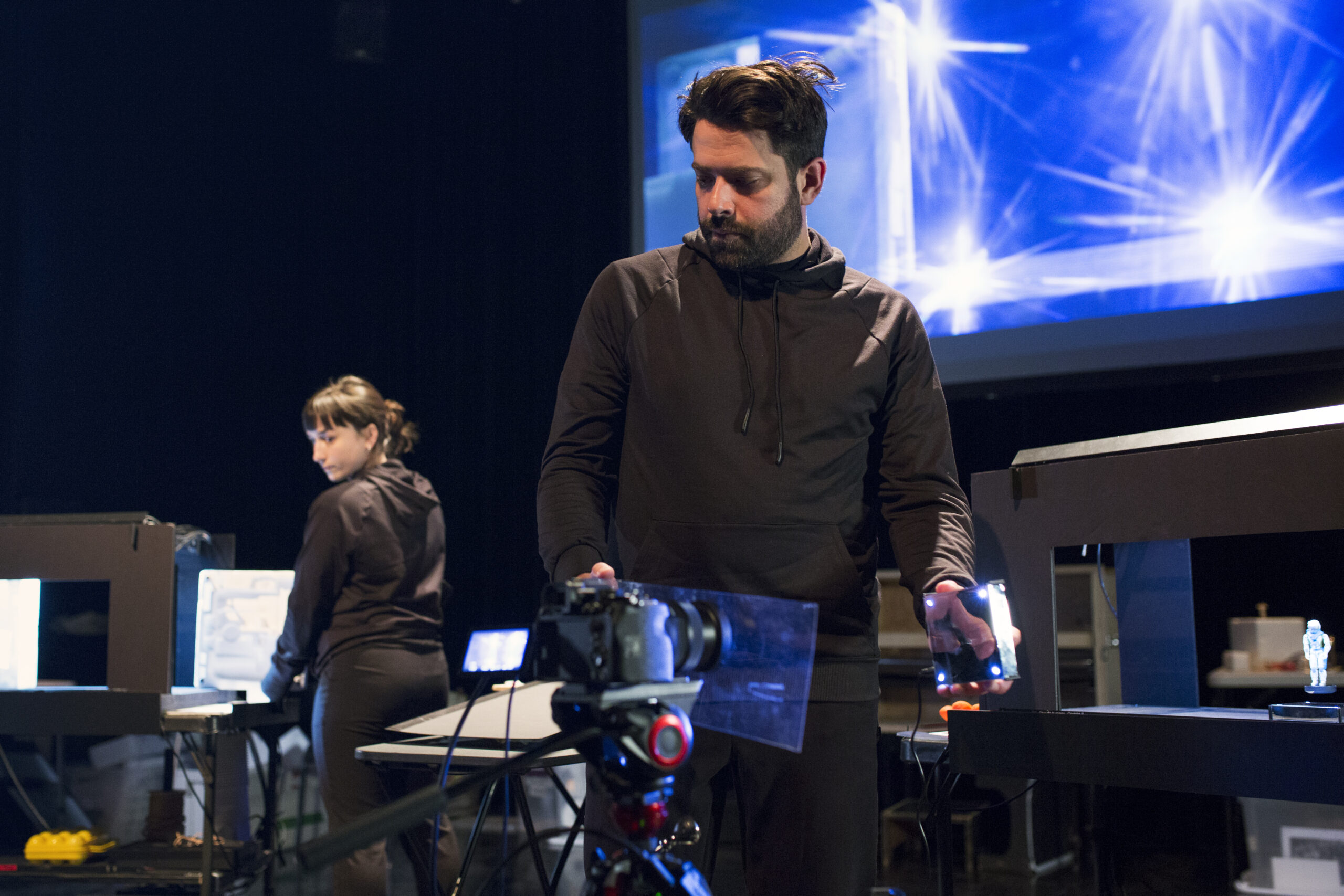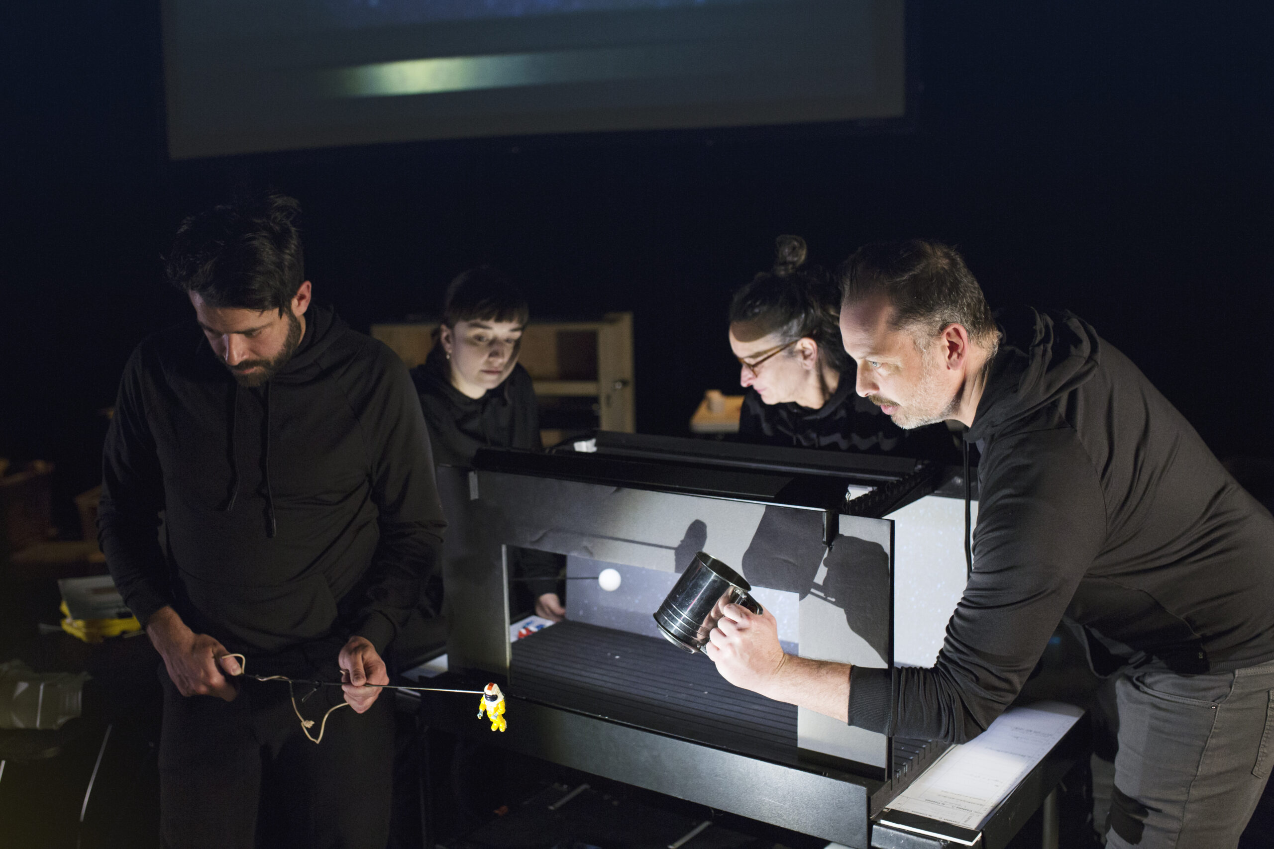 Le quatuor de manipulateur·rice·s formé de Marcelle Hudon, Alexandre Leroux, Étienne Blanchette et Joanie Fortin constitue une forte équipe d’acteur·rice·s-créateur·rice·s, nourrissant le projet par leur présence, leur précision et leur connaissance intime du langage de La Pire Espèce.
